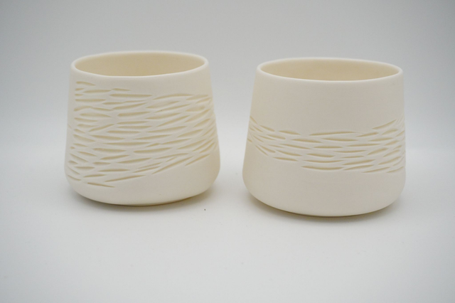 Disse stager er i porcelæns ler står helt rå uden glasur og mønstret der er skåret i starter bredt og slutter helt smalt. Smukke i vindueskarmen, eller på bordet - pynter flot i en mørk tid.