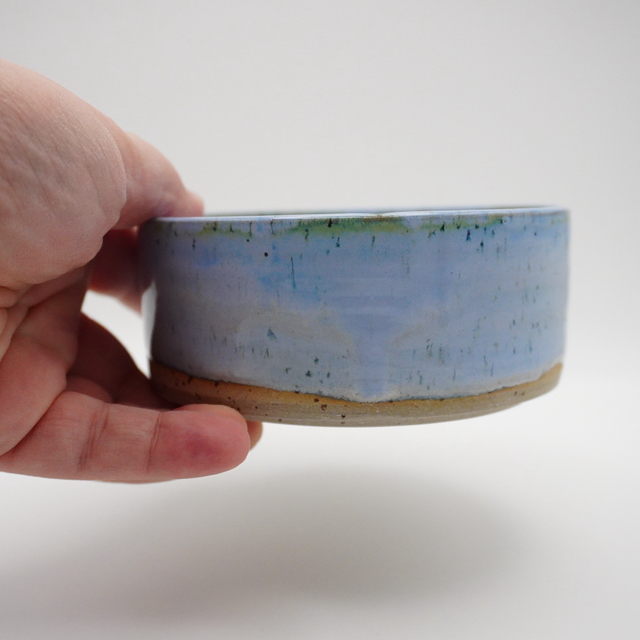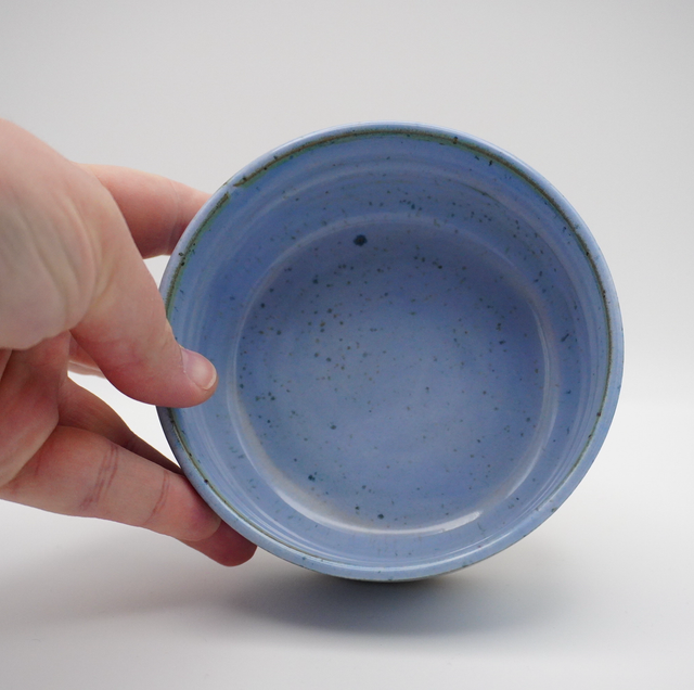 Denne lille skål udført i stentøj med lavapletter og glaseret med en smuk lys blå glasur.