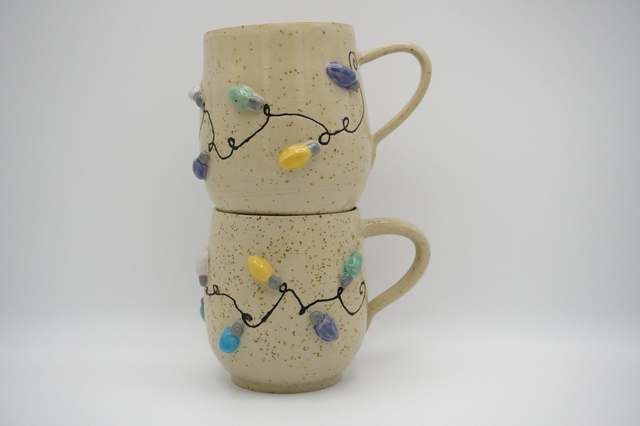 Denne lyskædekop i stentøj med lavapletter med en klar glasur som lader leret stå flot neutralt, og dekoreret med en lyskæde der vikler sig om koppen.