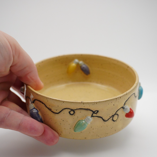 Denne Lydskædeskål er udført i stentøj med lavapletter og glaseret med en creme farvet glasur. Rundt langs kanten snor sig en fin lyskæde, og som fin lille detalje sidder to pærer inde i skålen.