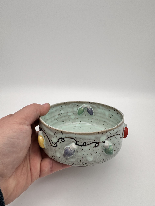 Denne Lydskædeskål er udført i stentøj med lavapletter og glaseret med en mintgrøn glasur. Rundt langs kanten snor sig en fin lyskæde, og som fin lille detalje sidder to pærer inde i skålen.