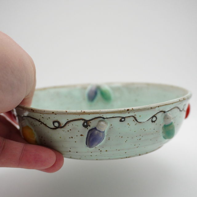 Denne Lydskædeskål er udført i stentøj med lavapletter og glaseret med en mintgrøn glasur. Rundt langs kanten snor sig en fin lyskæde, og som fin lille detalje sidder to pærer inde i skålen.