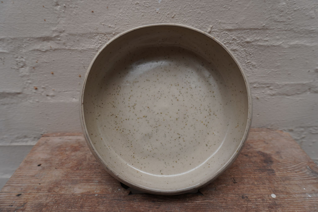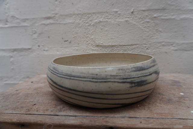 Lav buttet skål, i to slags stentøjsler den ene som er basen er en lys ler med lavapletter, striberne er en sort ler, glaseret med en klar glasur.