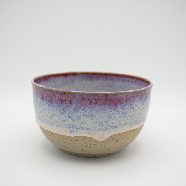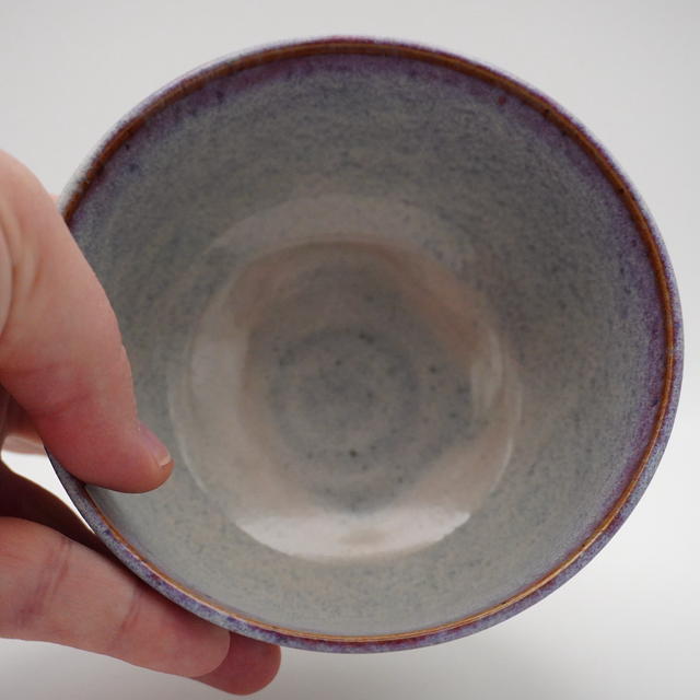 Lille skål i stentøjsler med lavapletter, i flot lyserød, blå og hvid glasur med små løbere.