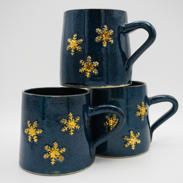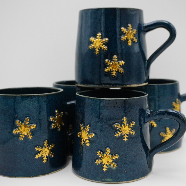 Denne snowflake kop i stentøj med lavapletter i fin blå glasur, og dekoreret med flotte snowflakes belagt med guld.